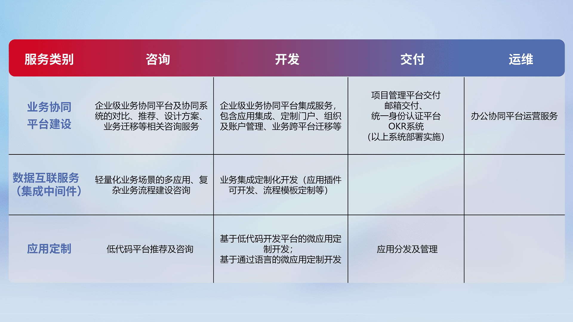 针对钉钉、、企微、、IDaas等平台级产品提供产品的规划、、方案、、交付、、、、定制化开发等服务,,实现如统一协同办公、、、智能客户服务、、、混合会议管理、、、、智能数据查询、、、、等业务场景,,实现数字化转型。。。