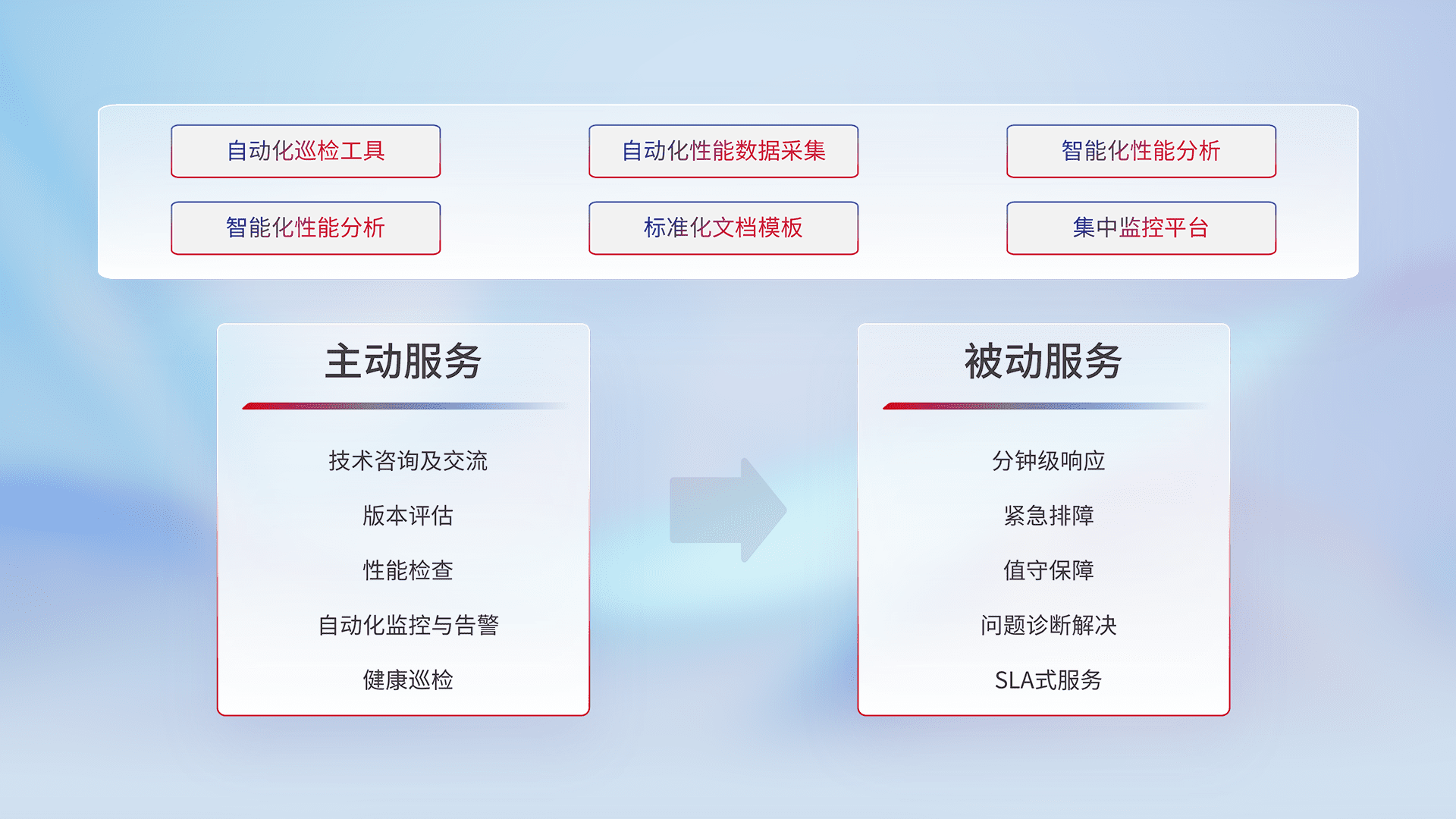 智能化工具和标准化文档,,,保障服务质量,,,,提供主动服务(包含技术咨询、、、、版本评估、、、、性能检查、、自动化监控与告警、、、健康巡检)和被动服务包含(分钟级响应、、、紧急排障、、值守保障、、问题诊断解决、、、、SLA服务)。。。