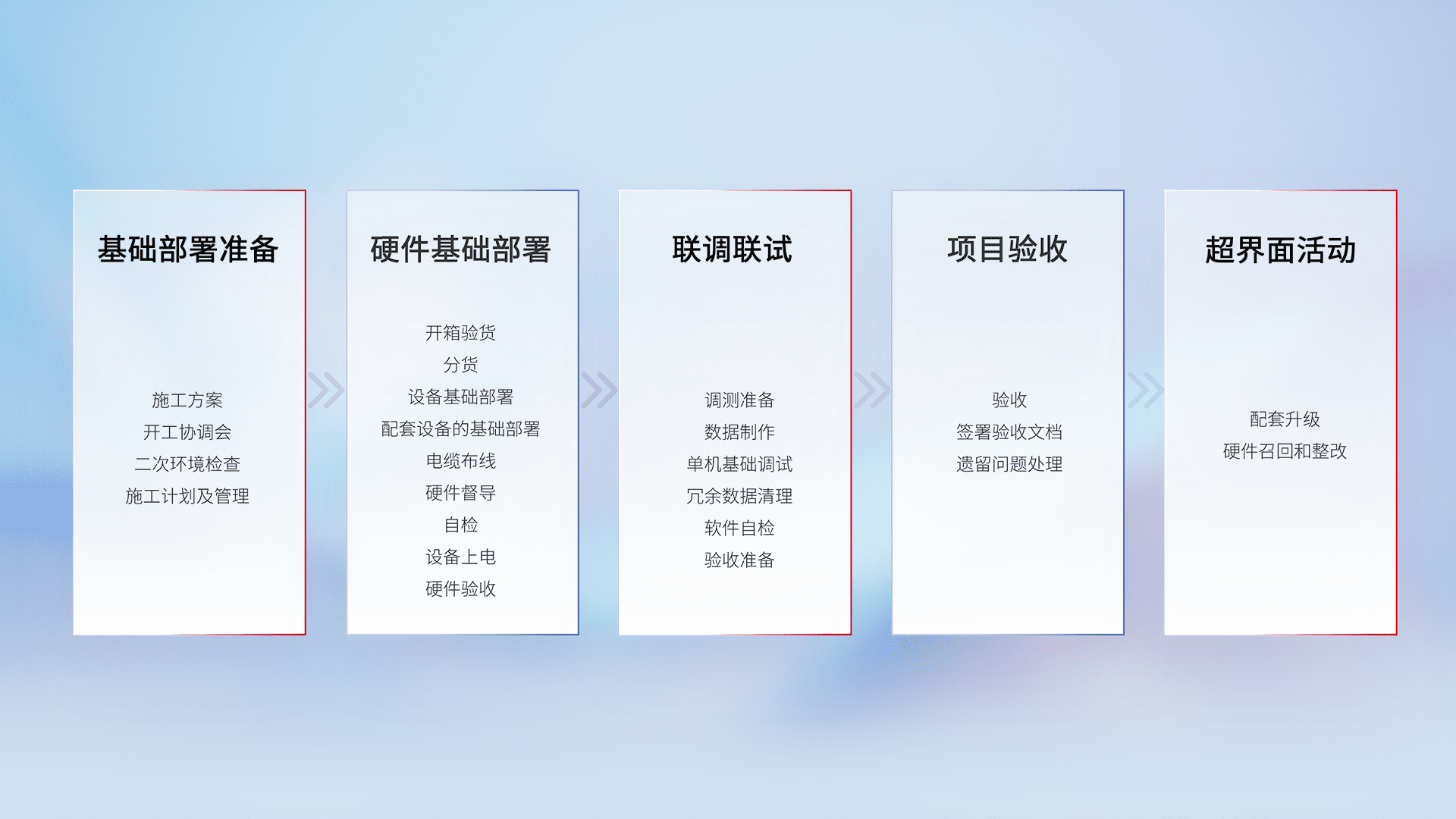 从基础部署准备、、硬件基础部署、、、联调联试、、、、项目验收、、越界面活动的全过程可追溯,,保证施工质量和进度。。